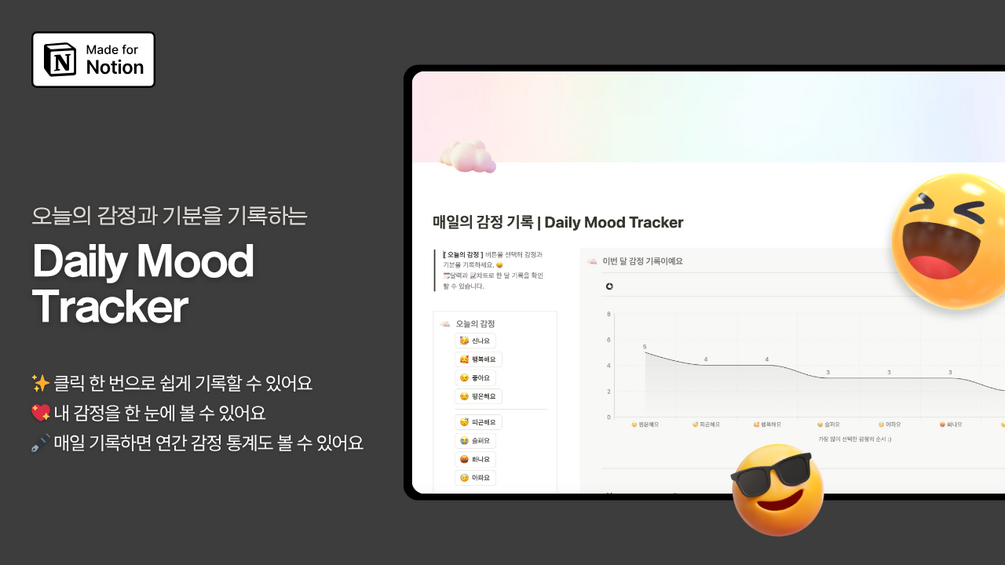 매일의 감정 기록 | Daily Mood Tracker$0+$0+https://schema.org/InStockusdONDARTONDART2 ratings매일의 감정 기록 - 나만의 감정 여정을 기록하세요✅ 환불이 가능한가요?디지털 자산은 구매 시 바로 템플릿이 전달되므로 환불이 불가능해요.구매 결정 전 신중히 고려해 주시기 바랍니다-✅ GUMROAD라는 사이트가 생소해서 구매하는 방법을 모르겠어요. 어떻게 구매하나요?아래 영상과 함께 영상에 있는 설명란을 참고해주시기 바랍니다.디지털 콘텐츠 크리에이터 ONDART가 만들었습니다.Canva | Instagram | Pinterest | NaverblogName a fair price:$Add to cartSoftwareNotionAccessLifetimeUpdatesNot IncludedAdd to wishlist New wishlistShareShare on XShare on Facebook Copy linkCopy product URLRatings5(2 ratings)255 stars100%4 stars0%3 stars0%2 stars0%1 star0%